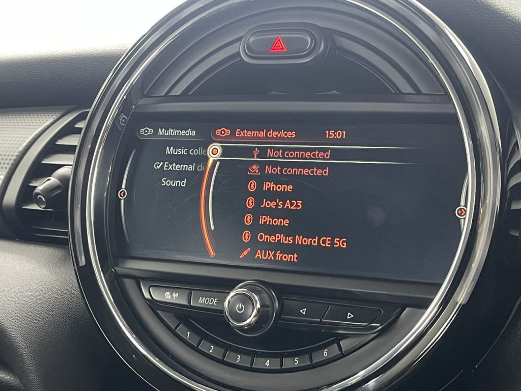 Other features: 7KN PEPPER Pack,Air Conditioning – Manual,Anthracite Headlining,Auto-Dimming Door Mirrors and Interior Rear View Mirror,Auto-Dimming Interior Rear View Mirror,Boot Release via Remote Control,Chrome Line Interior,Cockpit Chrono Package,Colour Line – Carbon Black,Colour Line – Dark Truffle,Colour Line – Glowing Red,Colour Line – Satellite Grey,Cupholders – Two in Front and One in the Rear Centre Console,Decorative Rings Surrounding Dashboard Instruments in Chrome Plated,Door Sill Finishers – Metal Look and Model Dependent Lettering,External Visible VIN,Floor Mats – Velour,Foldable Rear Backrest 60-40,Gearshift Lever Knob – Plastic,Gearshift-Selector Lever and Handbrake Lever Gaiters in Sensatec Artificial Leather,Handbrake Lever Grip – Plastic,Headliner – Satellite Grey,Headrests For All Seats – Manually Adjustable,Heater with Mechanical Control and Recirculating-Air Button,Interior Colour – Satellite Grey,Interior Door Handles – Chrome Plated,Interior Lights – Integrated into Centre Front Headliner,Interior Mi 15in Alloy Wheels – Heli in Silver,16in Alloy Wheels – Loop Spoke in Silver,16in Alloy Wheels – Victory Spoke in Black,17in Alloy Wheels – Cosmos in Black,17in Alloy Wheels – Cosmos in Silver,17in Alloy Wheels – Roulette Spoke – Two-Tone,17in Alloy Wheels – Track Spoke in Black,18in Alloy Wheels – Cone Spoke in Silver,18in Alloy Wheels – Cone Spoke in White,18in Alloy Wheels – Cup Spoke in 2-Tone,18in Alloy Wheels – Mini Yours Vanity Spoke – Two-Tone,7KN CHILI Pack,Body Coloured Fuel Filler Cap in Rear Right Side Panel – Linked to Central Locking,Bonnet Stripes – Black,Bonnet Stripes – White,Chrome Bezels around Rear Lights and Headlights,Chrome Line Exterior,Darkened Rear Glass,Door Handles – Chrome Plated,Electrically Folding Exterior Mirrors,Embellisher at Bottom Edge of All Windows – Chrome Plated,Exhaust Tailpipe – Visible – Single – Round with Chrome Finisher,Exterior Mirrors – Aspheric on Drivers Side – Electrically Adjustable,Front Side Indicators – Orange,Heated Front Windscreen,Heated Mirrors and Wi 3 Point Seatbelts on all Seats,Airbags for Driver and Front Passenger – 6 Airbags as Standard,Alarm and Immobiliser – Thatcham CAT 1,Anti-Lock Braking System – ABS,Brake Force Display,Brake Pad Wear Indicator,Comfort Access System,Condition Based Service,Crash Sensor,Driving Assistant Pack,DTC – Dynamic Traction Control with EDLC – Electronic Differential Lock Control,Dynamic Stability Control – DSC,Front Passenger ISOFIX and Airbag De-Activation Switch,Fuel Pump Automatic Cut-Off in Crash Situation,Locking System with Central Locking,On-Board Computer,Rear Window Wiper,Revolution Counter,Speedometer on Steering Column,TPWS – Tyre Pressure Warning System,Warning Triangle and First Aid Kit 17in Alloy Wheels – Tentacle Spoke in Silver,3rd Brake Light – Red,ACC – Active Cruise Control,Air Conditioning – Automatic Dual Zone,Black Pearl Cloth-Leatherette – Carbon Black – Carbon Black,Blazing Red,British Racing Green,CHILI Pack,Chili Red,Cross Punch Leather – Carbon Black – Carbon Black,Cross Punch Leather – Dark Truffle – Carbon Black,Cruise Control with Brake Function,Daytime Driving Lights,Deep Blue,Diamond Cloth-Leather – Carbon Black – Carbon Black,Electric Blue,Enhanced Bluetooth with USB Audio,Firework Cloth – Carbon Black,Follow Me Home Function,Front Centre Armrest,Front Fog Lights,Front Fog Lights – LED,Halogen Lights for Low Beam and High Beam Headlights,Harman Kardon Hi-Fi System,Headlight – Beam-Throw Control Electrical with Manual Adjustment,Interior Light Pack,Lapisluxury Blue,LED Headlights and Daytime Running Lights and Tail Lights,LED Headlights with Cornering Lights,Lounge Leather – Satellite Grey – Carbon Black,Media Pack XL,Melting Silver,Midnight Black,MINI Driving Modes,MINI E