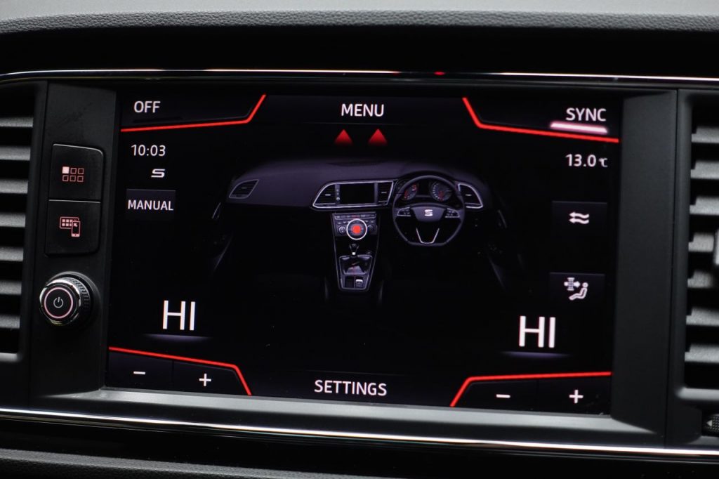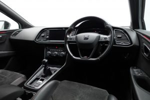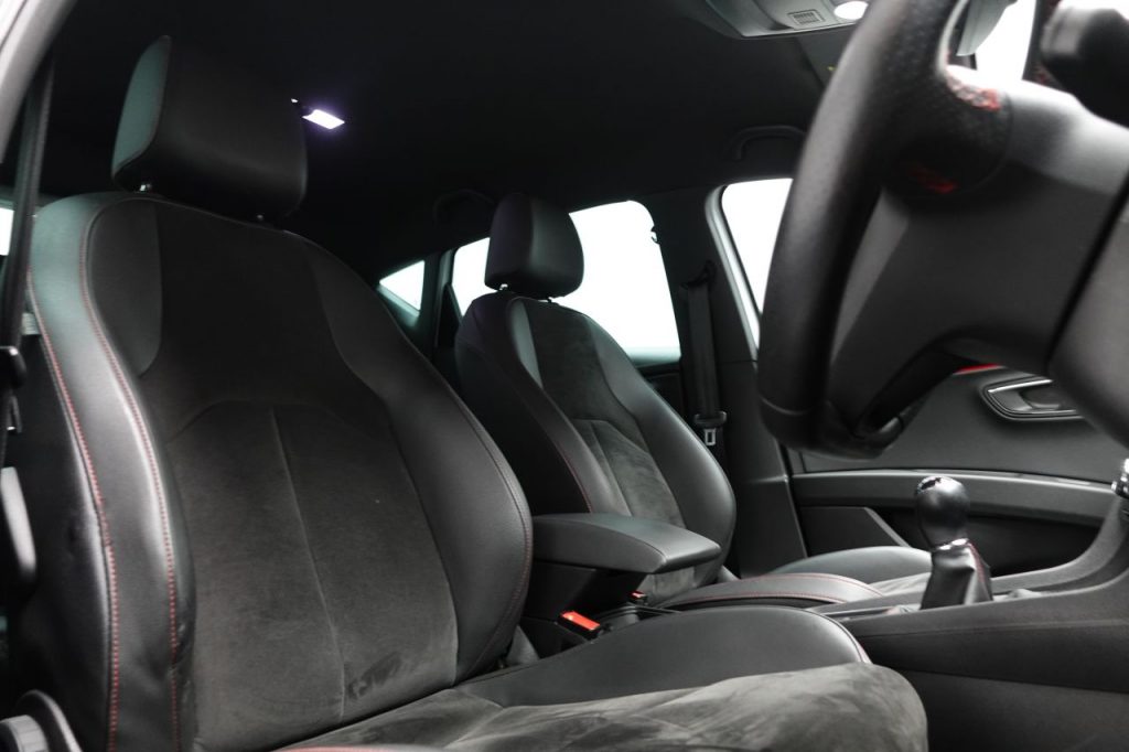 Other features: Armrest – Front with Storage Compartment,Black Interior Roof Lining,Convenience Pack Plus,Digital Cockpit,Driver and Passenger Seat Height Adjustment,Driver and Passenger Sunvisor with Covered and Illuminated Mirrors,Drivers Seat Lumbar Adjustment,Dual Zone Climate Control,Front Seat Back Storage Pockets,Front Sports Seats,Illuminated Aluminium Front Door Sill with Trim Logo,Instrument Lighting with Brightness Control,Leather Gear Knob,LED Interior Illumination Pack,Multi Coloured Ambient Lighting,Seats – Passenger Lumbar Adjustment,Split Folding Rear Seats 60-40 with Armrest,Steering Wheel – Flat-Bottomed Perforated Leather with Red Stitching and FR Logo,Storage Box Under Driver and Front Passenger Seat,Two Height-Adjustable Front and Rear Headrests,Winter Pack 18in Alloy Wheels – Performance Matte 30-2,Bumpers – Exclusive FR Front and Rear,Dark Tinted Rear Windows,Electrically Adjustable Folding and Heated Door Mirrors,Emergency Tyre Repair Kit,Front and Rear Electric Windows,Matte Black Door Mirrors with Integrated LED Indicators,Radiator Grille Frame in Matte Black,Radiator Grille in Black,Visual Twin Exhaust Pipes 7 Airbags,ABS and Traction Control System – TCS – Electronic Stability Control – ESC – and Electronic Differential Lock System – XDS,Alarm – Volumetric,Cruise Control,Digital Clock,Electric Parking Brake Including Autohold Function,Front and Rear Parking Sensors,Front Assist with Pedestrian Protection,Gearshift Indicator,ISOFIX Points in Outer Rear Seats with Top Tether Anchorage Points,Low Fuel Warning Light,Multi-Collision Braking System,Outside Temperature Gauge,RPM Counter,SEAT Drive Profile,Seatbelt Reminder – Front,Trip Computer,Tyre Pressure Monitoring System Electro-Mechanical Progressive Power Steering,Full LED Headlights,Lights Left On Warning Buzzer,Microsuede Sports Seats – Black with Red Stitching,Nevada White,Sports Suspension