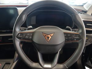Other features: 60-40 Rear Seats with Central Armrest and Mechanical Seat Release,Auto Dimming Rear View Mirror,Copper and Aluminium Interior Detailing,Front and Rear Head Restraints,Front Centre Armrest,Headlining – Black,Illuminated Interior Front Door Sills,Illuminated Sunvisor with Mirror,Leather Multi-function Steering Wheel – Heated with Gear Shift Paddles,Rain Sensing Wipers,Reading Lights – 2x Front – 2x Rear,Smart Wraparound Interior Lighting,Three Zone Climate Control with Control Panel in the Rear,Variable Luggage Compartment Floor,Welcome Lights 19in Alloy Wheels – Exclusive Machined Sport – Matt Black and Silver,Breakdown Kit,Electric Window – Front,Electrically Adjustable – Folding and Heated Door Mirrors with Memory Function,Electronic Locking Differential with Dynamic Traction Support,Gloss Black Roof Rails and Window Surrounds,Locking Wheel Bolts,Rear Diffuser with Black Simulated Exhaust Pipes,Tinted Rear Windows ABS – Anti-Lock Braking System,Airbag on Driver and Front Passenger Side with Front Passenger Airbag Deactivation,Anti-Theft Alarm,CUPRA Connect – Safety – Service – Remote and Online,Digital Cockpit and Configurable Dashboard,Driver Alert System,Driving Profile Selection,Electronic Parking Brake,Forward Collision Warning with Automatic Braking,Front Side Curtain Airbag,ISOFIX,Kessy – Keyless Entry and Start,Lane Assist,Park Assist – including Front and Rear Sensors,Predictive Adaptive Cruise Control with Speed Limiter,Rear View Camera,Safety and Driving Pack M,Seat Belt Reminder,Tyre Pressure Monitoring System Daytime Running Lights with Automatic Headlight Control and Coming-Leaving Home Lights,Dynamic Headlight Range Control,Front Fog Lights with Cornering Function,LED Headlight,LED Taillights with Dynamic Indicator,Midnight Black,Power Steering